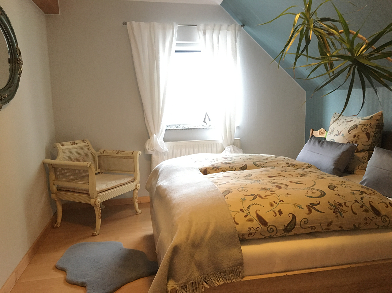 über eine Treppe in der Wohnung erreichbar mit wahlweise zwei Einzelbetten oder einem Doppelbett, 2 Sesseln, Tisch, Sat-TV, Duschbad, WC und Waschtisch.